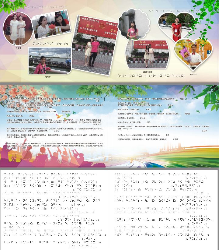 7月初,正值畢業(yè)季,生產(chǎn)中心機(jī)器不斷轟鳴,大伙正如火如荼的制作著一本本精美的畢業(yè)紀(jì)念冊(cè)。就在此時(shí),我們卻接到了一批非常特殊的畢業(yè)紀(jì)念冊(cè)訂單--"盲文紀(jì)念冊(cè) ? ?"。當(dāng)客人提出這批畢業(yè)紀(jì)念冊(cè)制作需要集觸覺、聽覺和視覺于一體,便于盲人識(shí)別時(shí),大伙都迷糊了,紀(jì)念冊(cè)制作如何體現(xiàn)觸覺和聽覺識(shí)別?這是個(gè)全新的難題。面對(duì)挑戰(zhàn),天意人敢于創(chuàng)新,在與客人深入溝通了解需求,我們充分探討各種可能性后,毅然接下這個(gè)特殊的訂單項(xiàng)目,因?yàn)樘煲庵驹?讓印刷走進(jìn)千家萬戶,為幸福生活添色加彩",而這也是我們天意人使命體現(xiàn)! ? ? ?