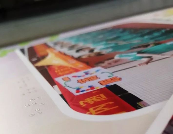 根據(jù)這個(gè)原則,我們?cè)诩o(jì)念冊(cè)的全局設(shè)計(jì)上,力求盲道的排列符合盲人的使用習(xí)慣。尤其體現(xiàn)在觸覺設(shè)計(jì)上,我們對(duì)點(diǎn)文符號(hào),點(diǎn)文進(jìn)行點(diǎn)對(duì)點(diǎn)的UV套印。由于UV一次的厚度大約是0.33mm,也就是說總共需要覆蓋3層,達(dá)到1mm左右的厚度,才能達(dá)到方便盲人識(shí)別的要求。每次套印需在上一次原點(diǎn)位置不能有絲毫偏差,這就要求印刷工作人員對(duì)UV打印精度的把握提升到微米的級(jí)別,稍不留神,便會(huì)前功盡棄。在聽覺處理上,我們采取制作音頻小程序,通過封面UV打印的盲道指引到二維碼,掃碼即可聆聽畢業(yè)班同學(xué)們的校園故事。? ? ?